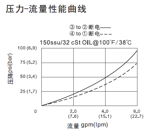 当电磁铁通电时,此阀允许油液③和④流动,①和②流动。