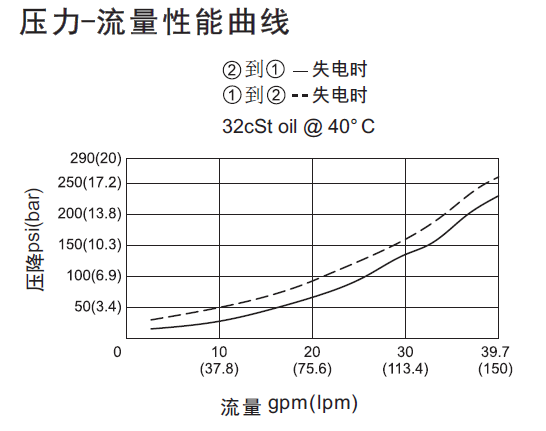 当电磁阀断电时,阀芯开启,允许油液从②流向①或者从①流向②。