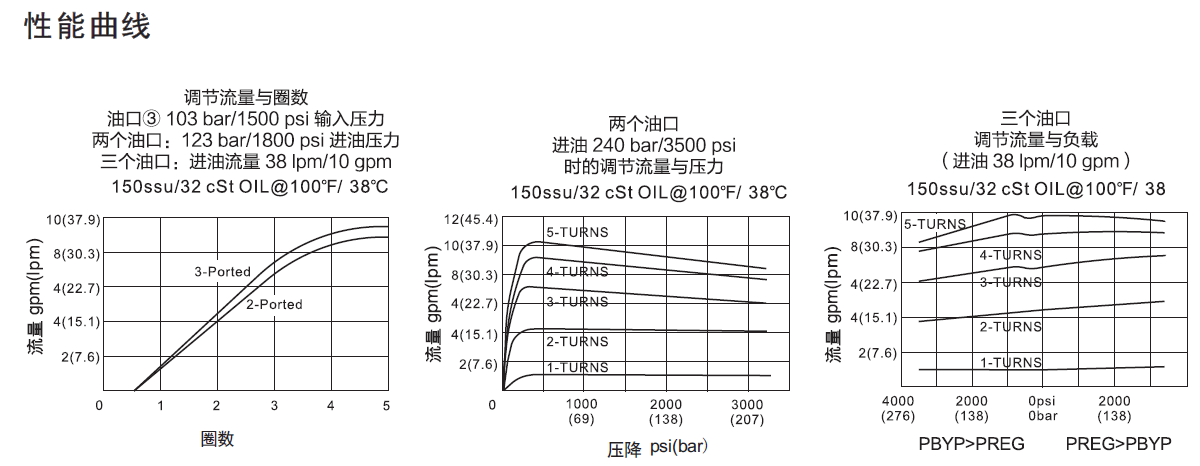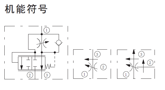该阀从③流出的流量保持不变,不受③的下游回路或旁路②的负载压力变化影响。反向液流(③流向①)不经过控制节流孔。逆时针转动手柄,调节流量从闭合到完全打开时逐渐增加。