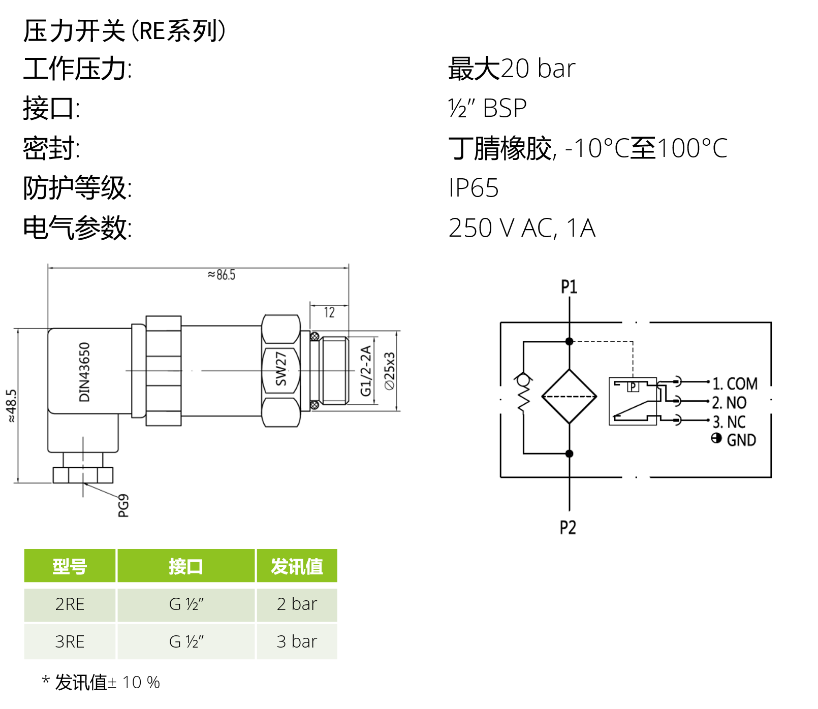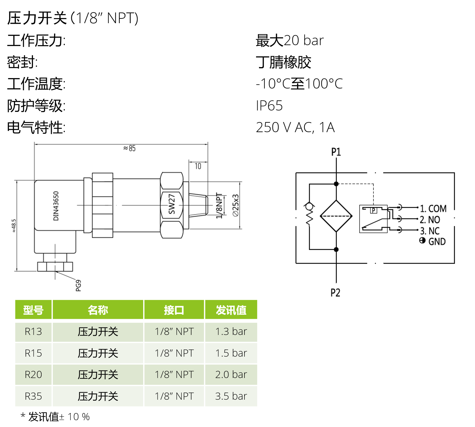 压力&真空开关 根据您的需求来选择配置EVOTEK产品。进入“选项”来查看产品的配置。 型号 选择一个选项2RE3RER13R15R20R35S02S03清除 数量 加入购物车 添加至报价单已添加至报价单从报价单中删除已添加至报价单从报价单中删除 描述 描述 产品描述工程制图下载产品描述 耐压值: 最大20 bar 密封: 丁腈橡胶 工作温度: -10°C至100°C 防护等级: IP65 电气特性: 250 VAC, 1A 关于产品的问题? 联系我们 工程制图 下载 英文产品数据表下载 中文产品数据表下载