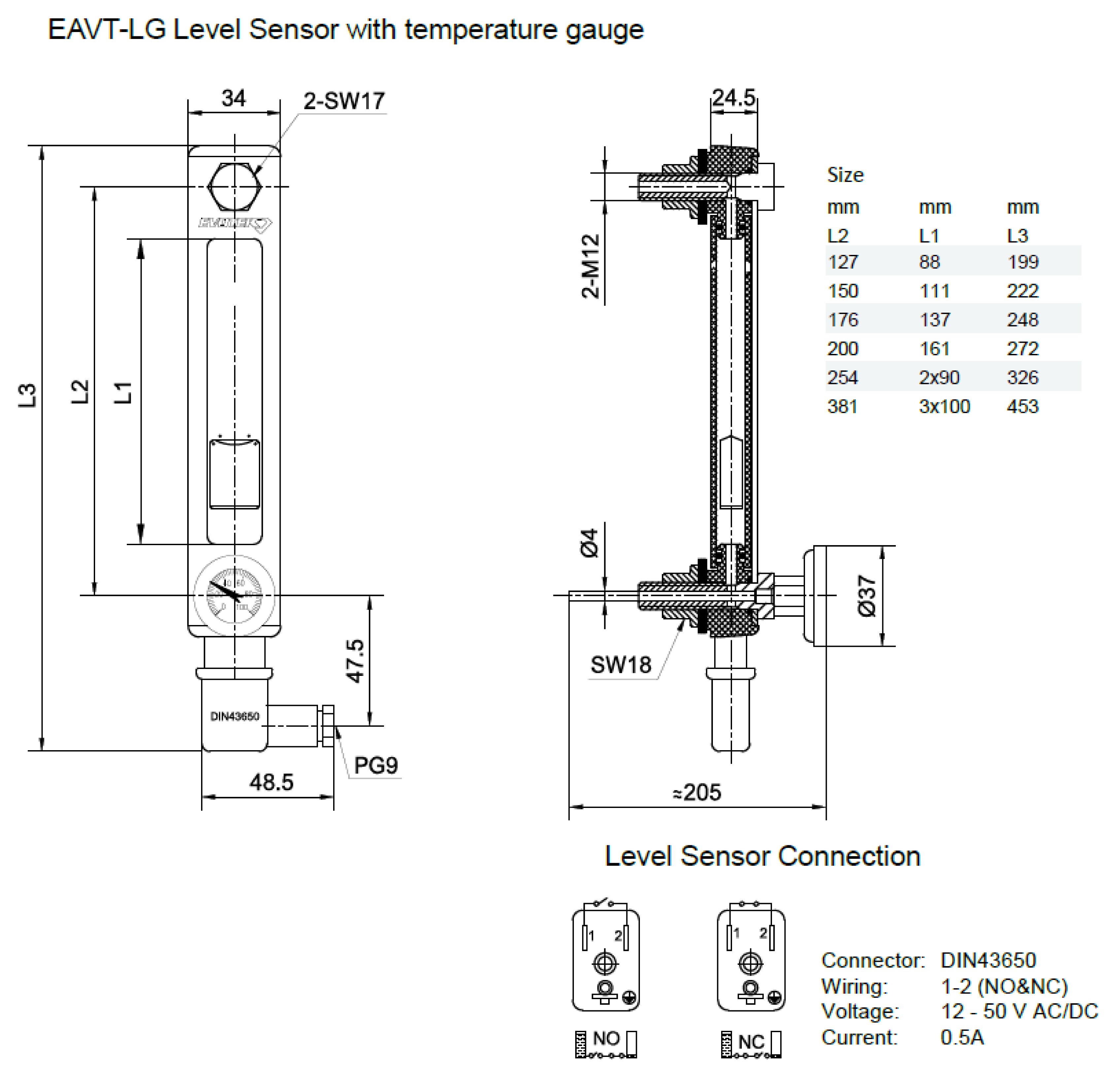 Mounting position: Vertically on the tank wall (connection plug at bottom of the tank)
