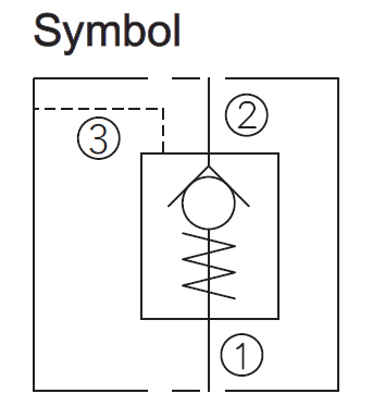 This valve is a pilot to open check valve. It has a non-sealed pilot, a steel seat, and is non-vented. It allows free flow from the valve (port 2) to the load (port 1) and blocks flow in the opposite direction. Pressure at the pilot (port 3) will open the valve from port 1 to port 2. Pilot pressure needed at port 3 to open the valve is directly proportional to the load pressure at port 1. Pressure at port 2 directly opposes pilot pressure.