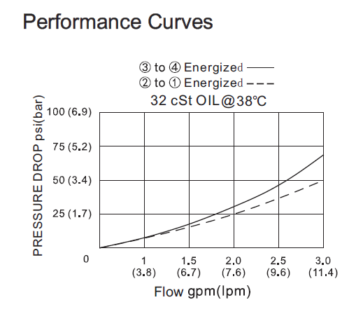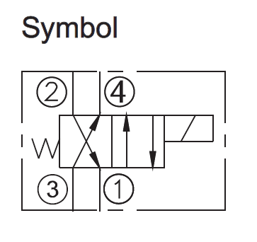 When energized, the valve’s spool shifts to open port 3 to port 2, and port4 to port 1.