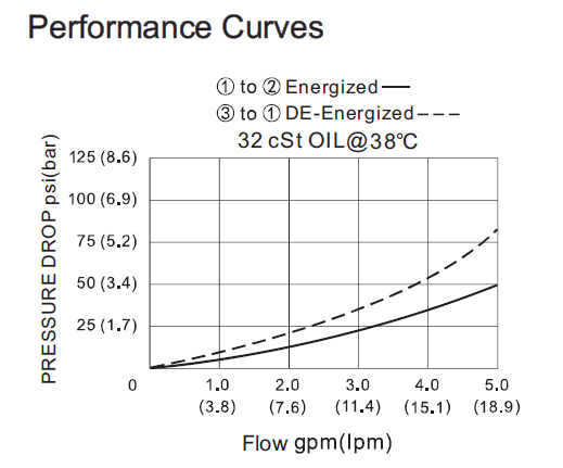When energized, the EVCE-SV10-33 allows flow from port 1 to port 2, while blocking flow at port 3. When de-energized, the cartridge’s spool shifts to open from port 3 to port 1, while blocking flow out port 2.