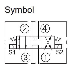 When coil 1 is energized, flow is allowed from 3 to 2, and from 4 to 1. When coil 2 is energized, flow is allowed from 3 to 4, and from 2 to 1.