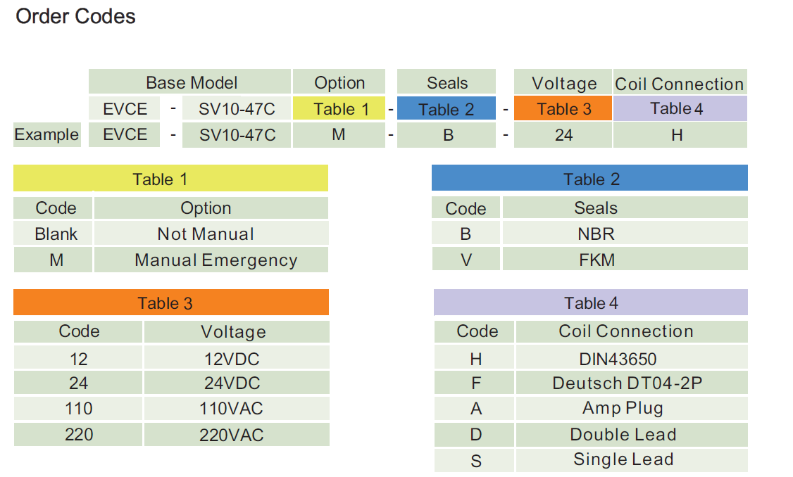 When de-energized, the EVCE-SV10-47C blocks all ports. When coil 1 is energized, flow is allowed from 3 to 4, and from 2 to 1. When coil 2 is energized, flow is allowed from 3 to 2,and from 4 to 1.