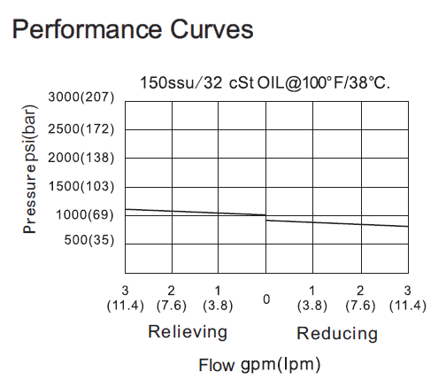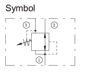 On attainment of a pre-determined pressure at port ①, the cartridge shifts to block flow at port②, thereby regulating pressure at port ①. In this mode, the valve will also relieve port 1 to port ③ at a variable value over the set reducing pressure.