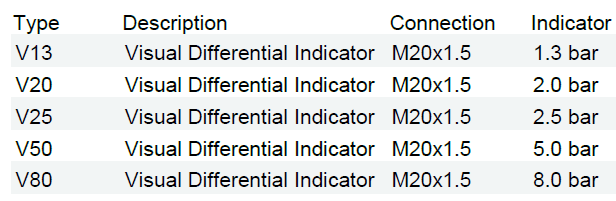 Visual Differential Indicator-V50 Configure EVOTEK products according to your requirements using product codes and order information in the tab “Options” below. Table1 Choose an optionV13V20V25V50V80Clear Quantity Add to cart Add to QuoteProduct Added to QuoteRemove from QuoteProduct Added to QuoteRemove from Quote Description Additional information Reviews (0) Description DescriptionOptionsDrawingsDownloadDescription Product Description Visual Differential Indicator Operating pressure:max. 420 bar Seals:NBR Temperature range:-10°C to 100°C Questions regarding the product? Contact us Options Drawings Download Download Specification EN Download Specification CN Additional information Table1 V13, V20, V25, V50, V80 Reviews There are no reviews yet. Be the first to review “Visual Differential Indicator-V50” Cancel replyYou must be logged in to post a review.