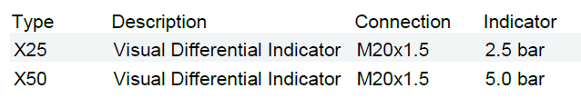 Visual Differential Indicator-X50 Configure EVOTEK products according to your requirements using product codes and order information in the tab “Options” below. Table1 Choose an optionX25X50Clear Quantity Add to cart Add to QuoteProduct Added to QuoteRemove from QuoteProduct Added to QuoteRemove from Quote Description Additional information Reviews (0) Description DescriptionOptionsDrawingsDownloadDescription Product Description Differential Pressure Indicators Operating pressure:max. 420 bar Seals:NBR Temperature range:-10°C to 100°C Questions regarding the product? Contact us Options Drawings Download Download Specification EN Download Specification CN Additional information Table1 X25, X50 Reviews There are no reviews yet. Be the first to review “Visual Differential Indicator-X50” Cancel replyYou must be logged in to post a review.