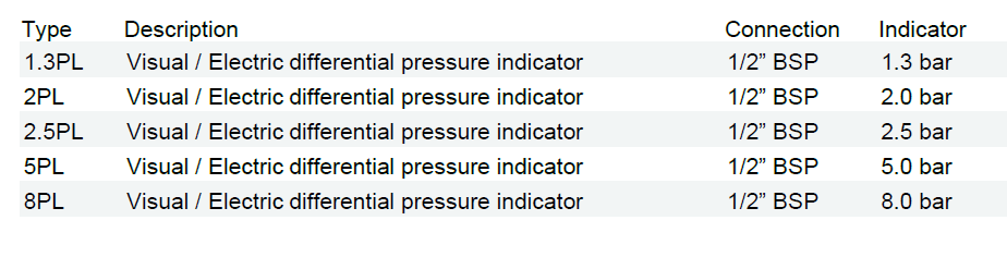 Visual / Electrical Differential Pressure Indicator-5PL Configure EVOTEK products according to your requirements using product codes and order information in the tab “Options” below. Table1 Choose an option1.3PL2PL2.5PL5PL8PLClear Quantity Add to cart Add to QuoteProduct Added to QuoteRemove from QuoteProduct Added to QuoteRemove from Quote Description Additional information Reviews (0) Description DescriptionOptionsDrawingsDownloadDescription Product Description Visual / Electrical Differential Pressure Indicator Operating pressure:max. 420 bar Seals:NBR Temperature range:-10°C to 100°C Ingress protection:IP65 Electric characteristics:24 VDC, 10W Questions regarding the product? Contact us Options Drawings Download Download Specification EN Download Specification CN Additional information Table1 1.3PL, 2PL, 2.5PL, 5PL, 8PL Reviews There are no reviews yet. Be the first to review “Visual / Electrical Differential Pressure Indicator-5PL” Cancel replyYou must be logged in to post a review.